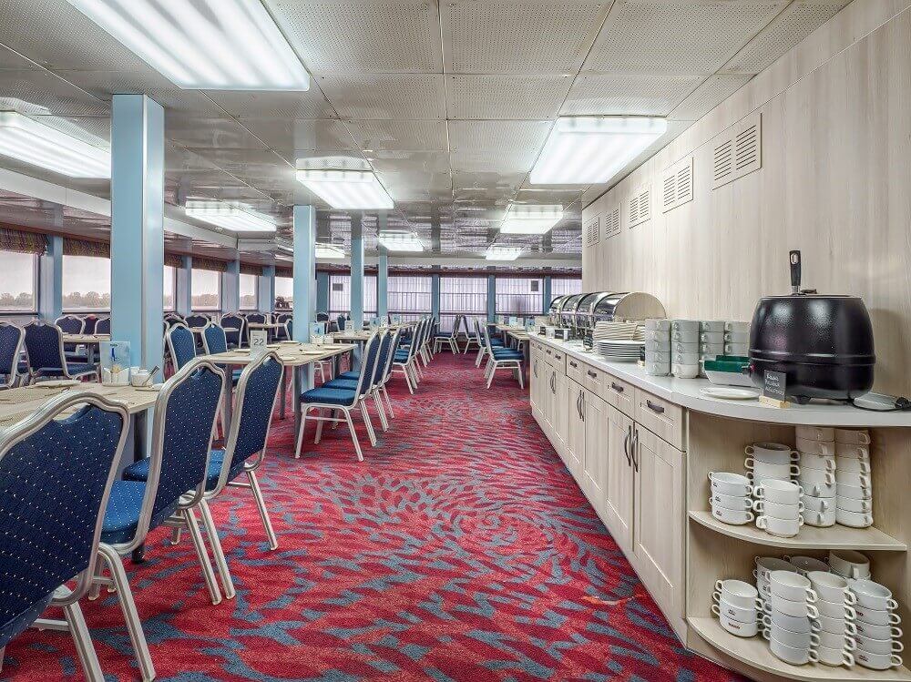 - Питание, организованное по гастрономической концепции « Родные берега ». Круизная кухня выполнена в лучших традициях побережья Поволжья, Дона, Чёрного моря, Енисея, Русского Севера и Восточной Сибири. В приготовлении используются свежие локальные продукты из регионов путешествия;