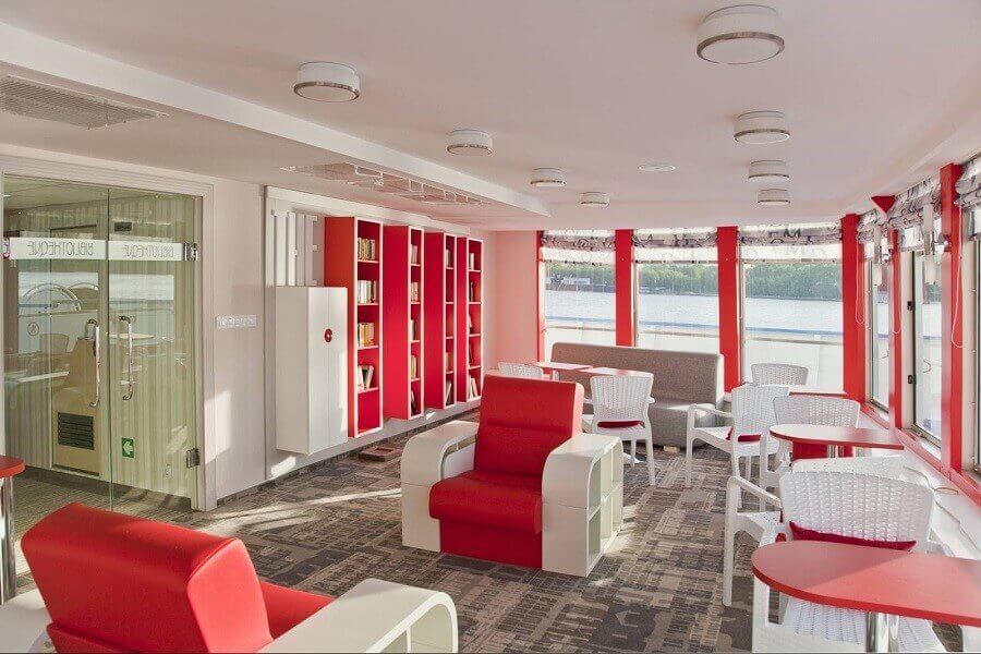 Одна из особенностей теплохода – дизайнерский интерьер в стиле работ основоположника абстракционизма Василия Кандинского. В многочисленных лаундж-зонах с мягкой яркой мебелью можно провести свободное время за чтением книг, настольными играми или просто любоваться пейзажами за бортом. Почти треть из 114 кают относятся к категории двухместный «Люкс».