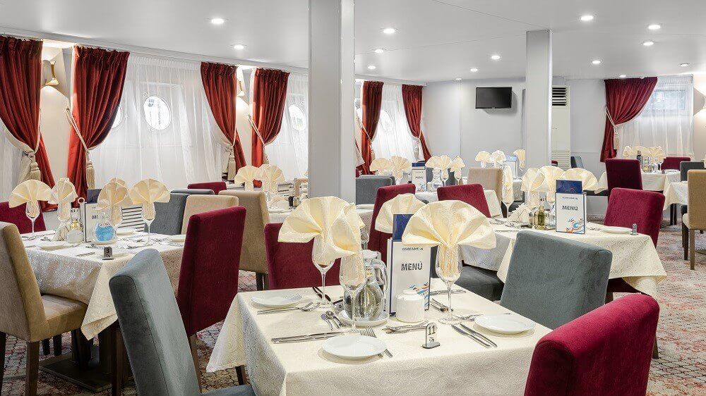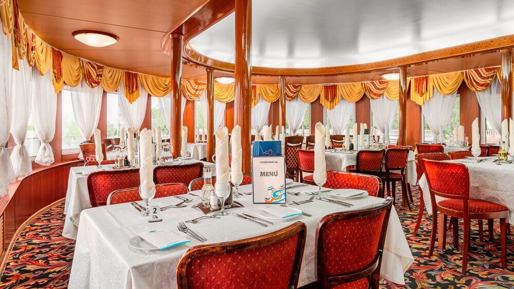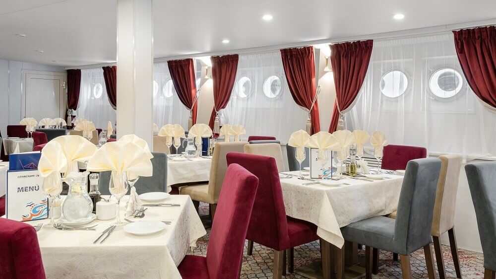 На всех теплоходах компании «Созвездие» действует единая концепция питания (читать подробности). Если у вас имеются особые требования к питанию или противопоказания на определенные продукты, сообщите об этом менеджеру при бронировании круиза, мы передадим ваши пожелания и блюдо будет приготовлено индивидуально. По запросу в ресторане есть диетическое меню и также есть детское меню.