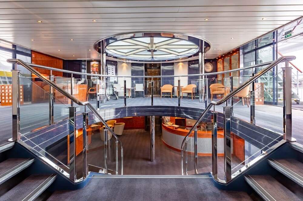 Светлые интерьеры кают и общественных помещений, а также просторный вестибюль со стеклянным куполом, простирающимся на две палубы, создают на борту расслабляющую и уютную атмосферу. Почти все каюты оборудованы французскими балконами, что гарантирует свободный обзор и восхитительные виды за бортом.