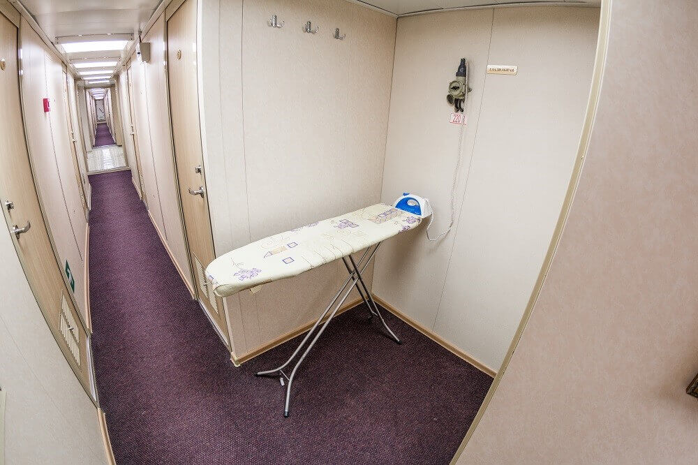 В каюте: две односпальные кровати, ванная комната (раковина, душ, туалет), кондиционер «Фанкойл», тумба прикроватная, шкаф, телевизор, мини-холодильник, телефон. |