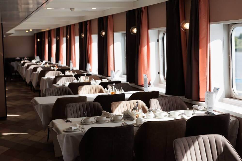 Во время экскурсий в городах по маршрутам путешественники открывают для себя новые и интересные места, а на борту есть все для приятного отдыха: ресторан, панорамный бар и бар с лекторием на солнечной палубе, пассажирский лифт, соединяющий все палубы, кофе-станция, сувенирный киоск и медицинский пункт.