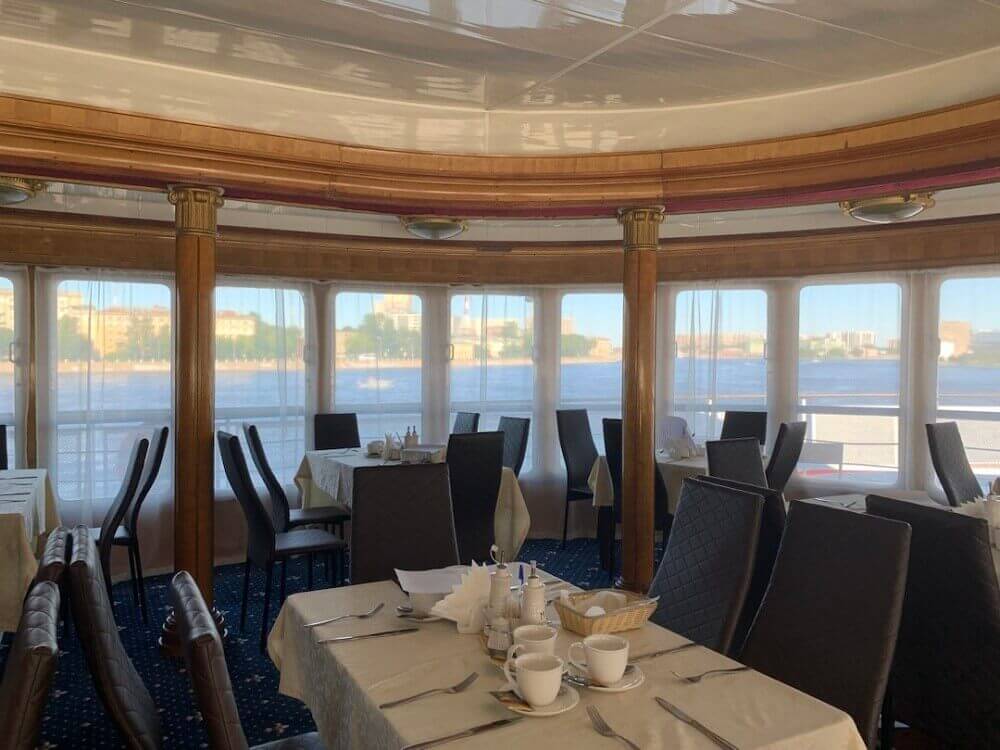 Первая услуга по питанию при посадке на теплоход до 14:00 – обед, до 20:00 – ужин. Рестораны расположены на главной палубе (нижний и боковой салоны) и шлюпочной палубе (верхний салон). Бар находится на средней палубе.