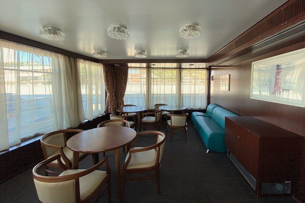 Во всех каютах: шкаф для одежды, радио, кондиционер, холодильник, душ, санузел, обзорное окно (на нижней палубе – иллюминаторы), розетка 220V.