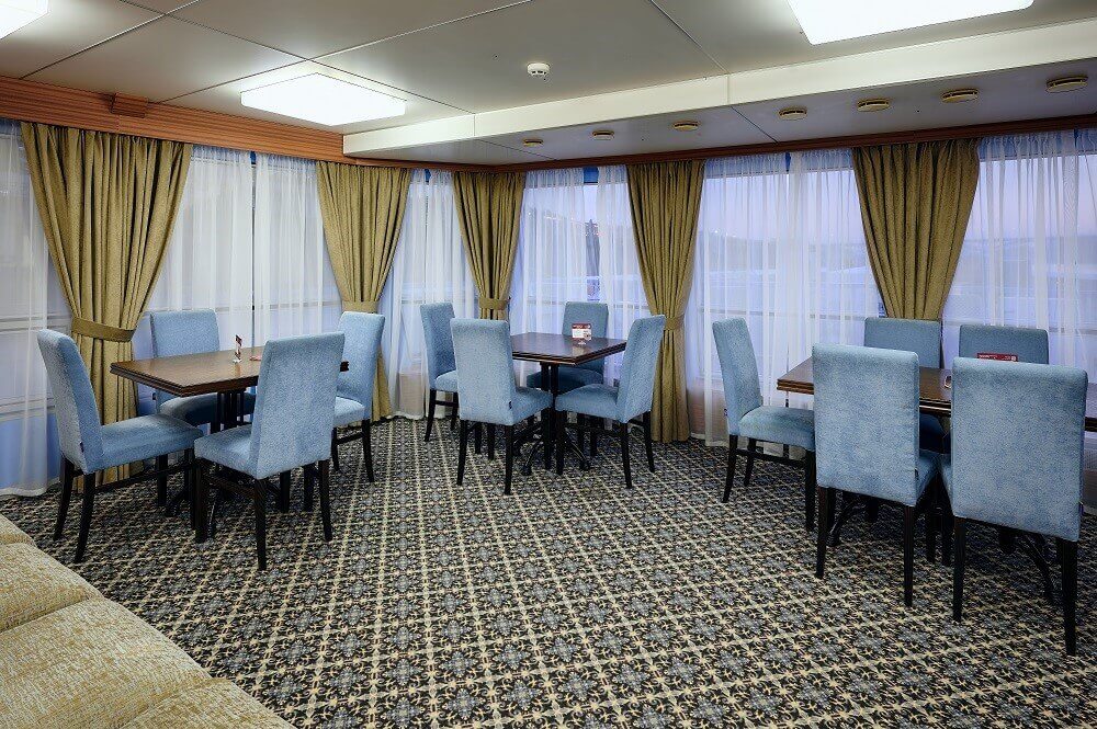 - Завтрак — шведский стол или заказная система с элементами шведского стола, фиксированная рассадка. Включённые напитки (без ограничения): вода, сок, чай, кофе. В рейсах до 4-х дней при ранней высадке в день прибытия завтрак континентальный;