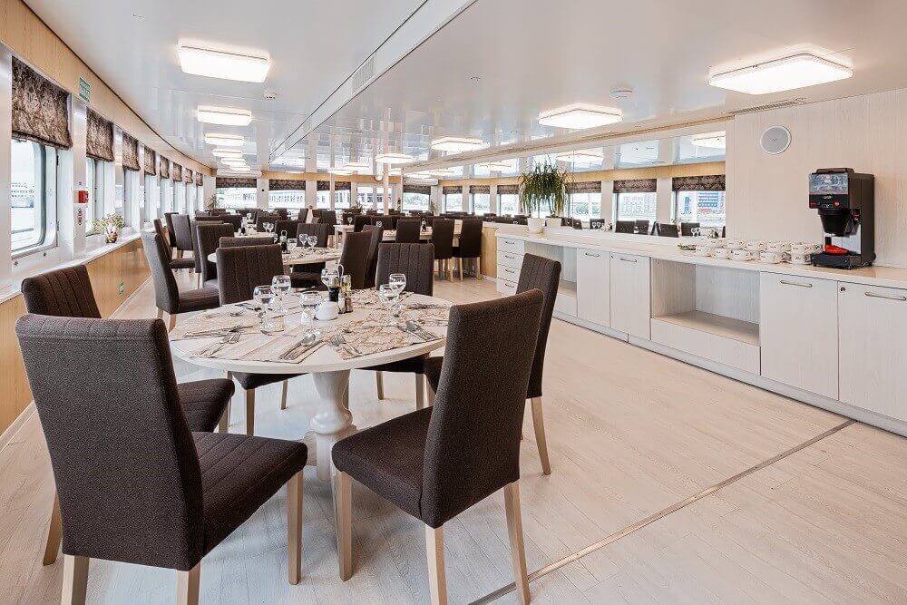 - Обед – заказная система питания (выбор блюд со 2-го дня круиза), фиксированная рассадка. Включённые напитки (без ограничения): вода, чай, кофе, морс.