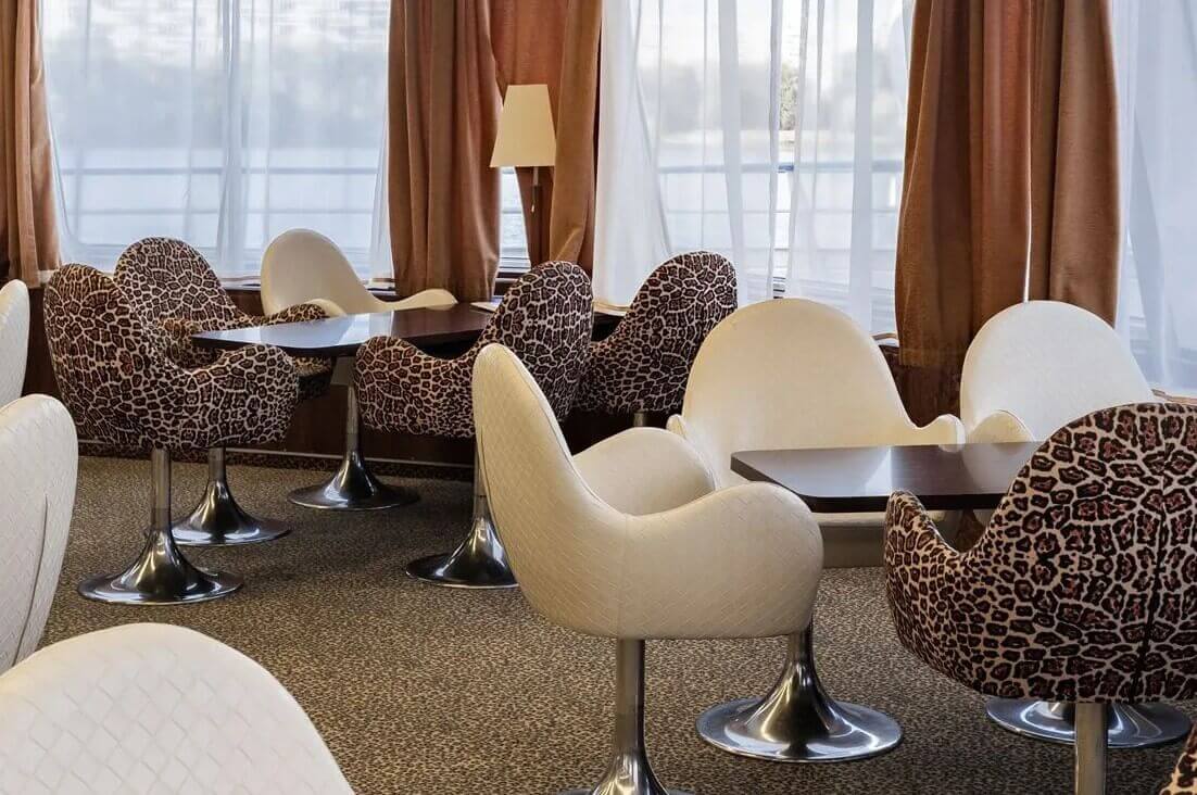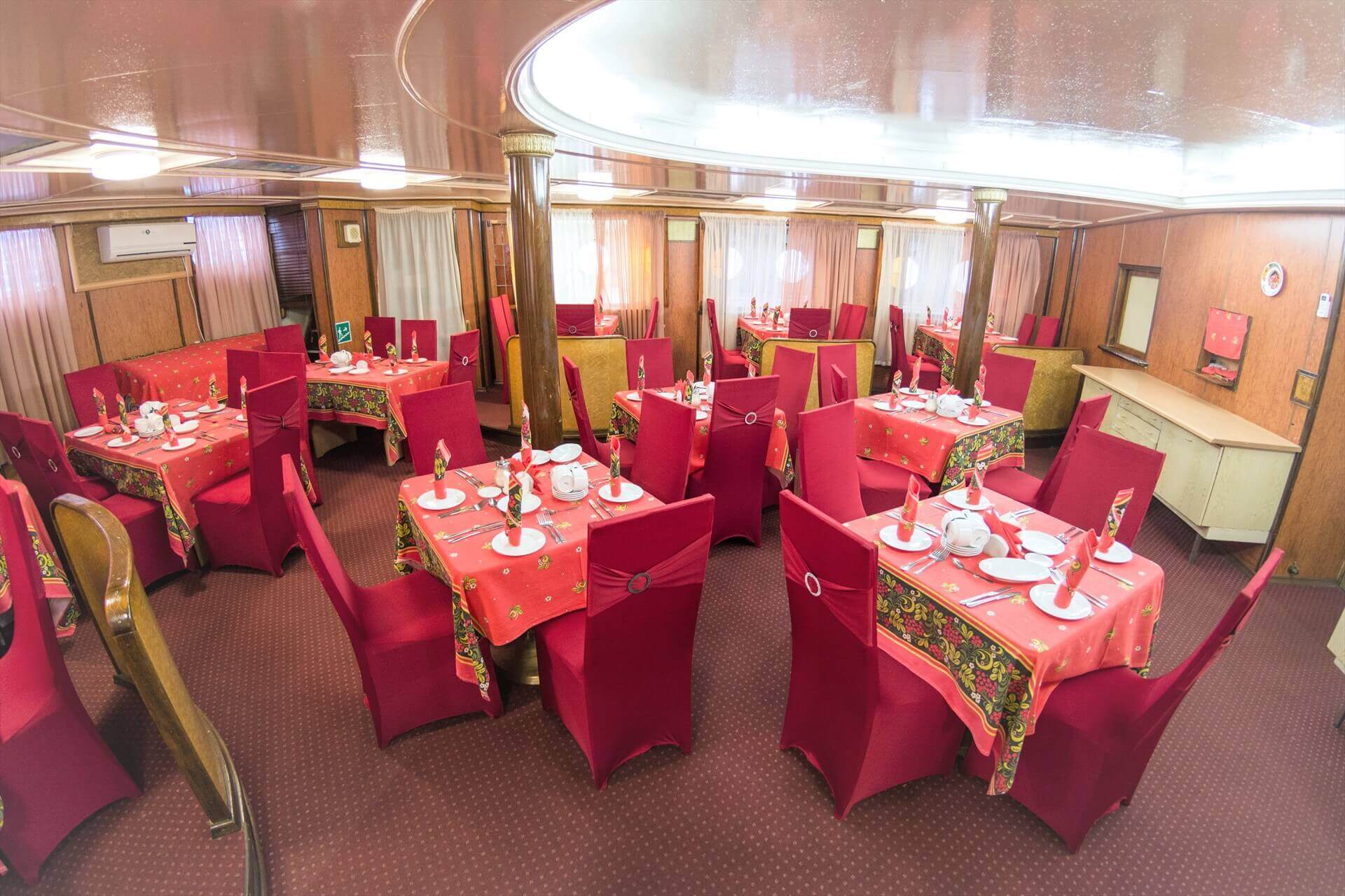- Обед — заказная система питания (выбор блюд со 2-го дня круиза) с элементами шведского стола (десерт, фрукты, морсы), фиксированная рассадка. Включённые напитки (без ограничения): вода, чай, кофе, домашний морс;