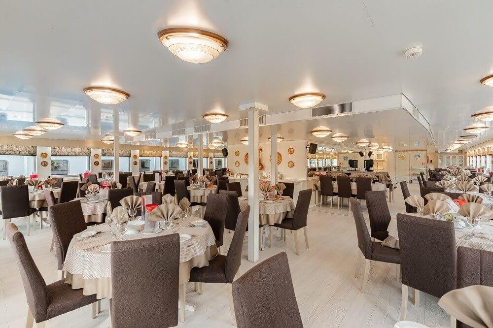 • Питание в соответствии с выбранным тарифом: завтрак, полупансион, полный пансион. В день начала и день окончания круиза питание предоставляется в зависимости от времени посадки и высадки; в случае, если время проведения экскурсии совпадает со временем приема пищи, гостю предоставляется питание в ресторане/кафе города или выдается «ланч-бокс»