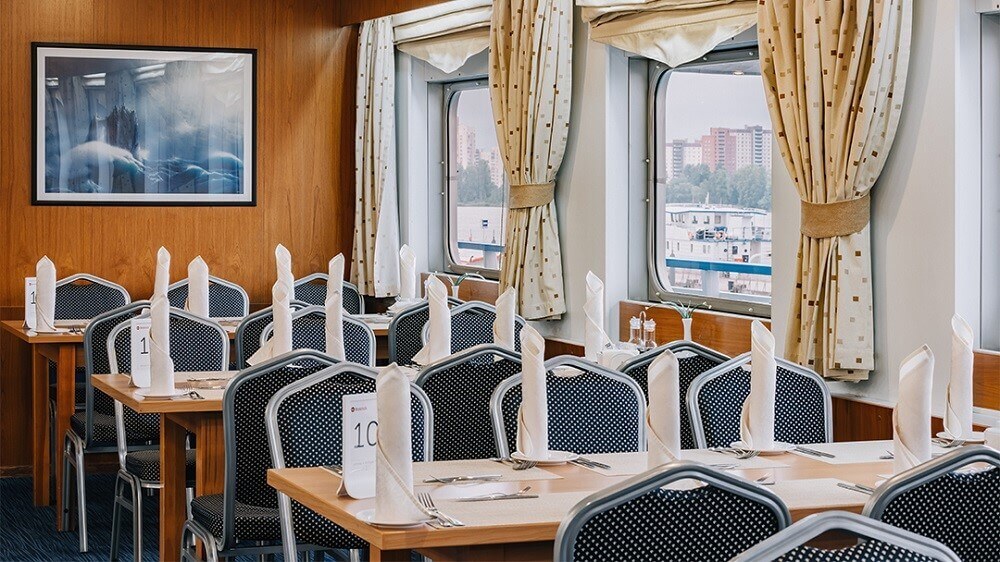 - Ужин — заказная система питания (выбор блюд со 2-го дня круиза). Включённые напитки (без ограничения): вода, чай, кофе, кисломолочный напиток (1 стакан 200 мл на ужин по запросу гостя). На выбор: вино красное / белое / игристое (1 бокал, 125 мл) / водка (1 рюмка, 50 мл) / пиво (1 бокал, 300 мл), домашний морс (1 бокал, 200 мл);
