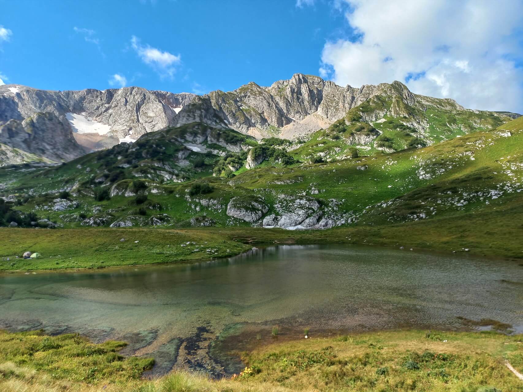 Проходим вдоль «леопардового» озера и скальных лбов. Часто делим малохоженую тропинку с дикими сернами. Здесь мы гости. С каждым часом приближаемся к приюту Фишт. Идем налегке, весь багаж «переезжает» на вьючных лошадях вокруг массива. Экономия сил и времени очевидна.