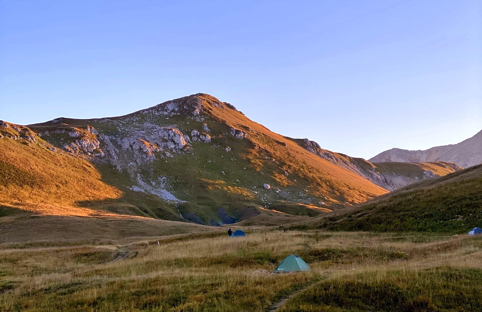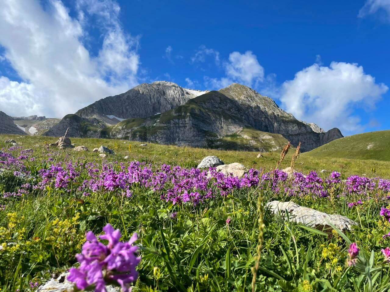 Впереди: бескрайний простор плато с его табунами лошадей, карстовыми воронками и ослепительно белыми пятнами снежников на зеленых склонах, захватывающая панорама горных хребтов и долин с высоты более двух километров. Огромные седые глыбы, разбитые трещинами и застывшие, словно волны в штормовом Каменном море, вершины Главного Кавказского хребта. Поход налегке позволит изучить Каменное море со всех сторон, новые локации, ракурсы с хребта Нагой-Кош. Заповедные места, субальпийские луга – все это на пути к альпийскому приюту.