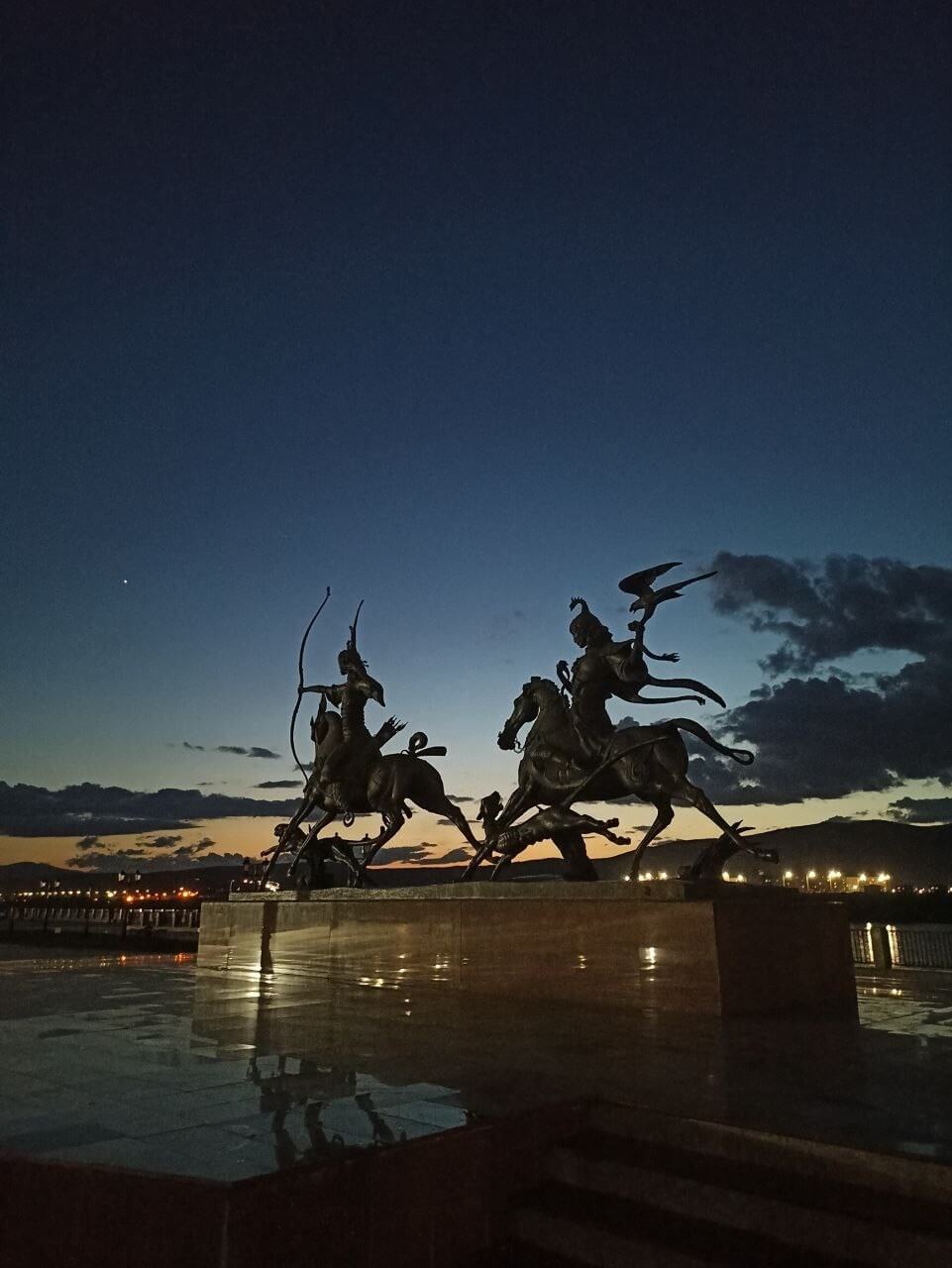 Памятный знак «Центр Азии» знаменитого скульптора Даши Намдакова – стела на берегу Енисея, символ географического центра Азии. Здесь же установлены скульптурная группы: бронзовая «Царская охота» и мраморная «Мой дом». Справа от них две реки: Каа-Хем и Бий-Хем сливаются, образуя великую сибирскую реку – Енисей.