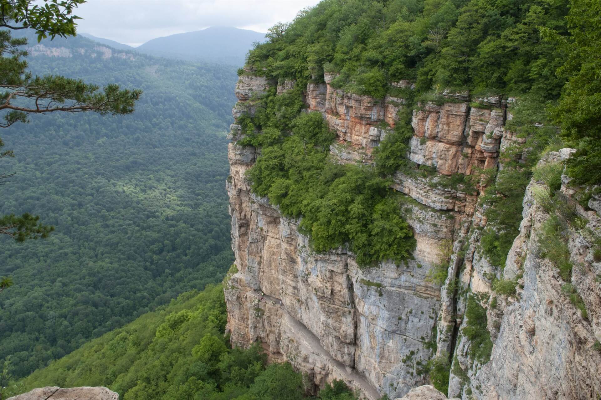 В семи километрах от поселка, а точнее над ним, нависает отвесная скала на высоте птичьего полета, в которой будто специально оставлена бороздка в человеческий рост, чтобы ходили и впечатлялись. Набираем высоту. Внизу извивается река Курджипс, а вдоль нее узкоколейка, уходящая в знаменитое Гуамское ущелье. Долина, горы, скалы – место неимоверно красивое!