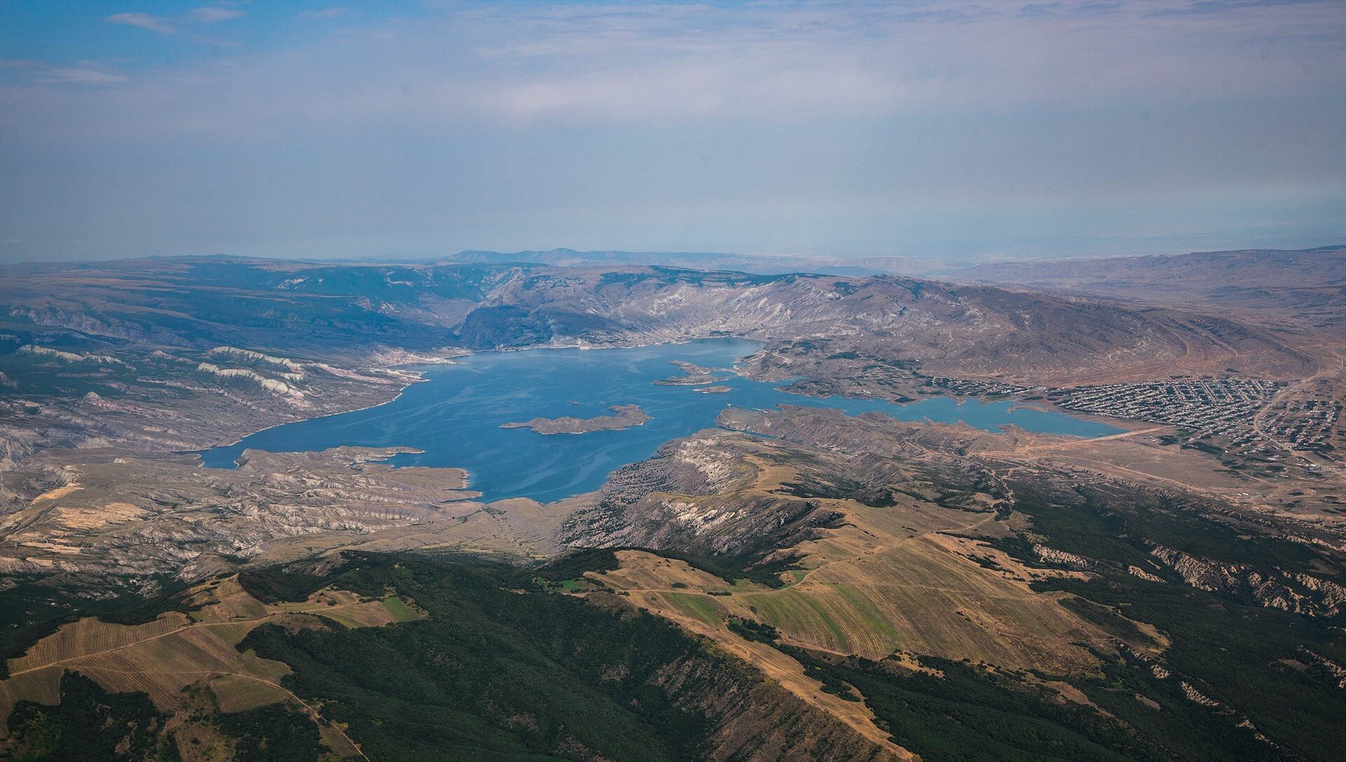 После полуторачасового переезда окажемся на смотровой площадке у Чиркейского водохранилища, расположенной на высоте 1 500 м над уровнем моря. Отсюда открываются захватывающие виды на реку Сулак и окружающие горные хребты.