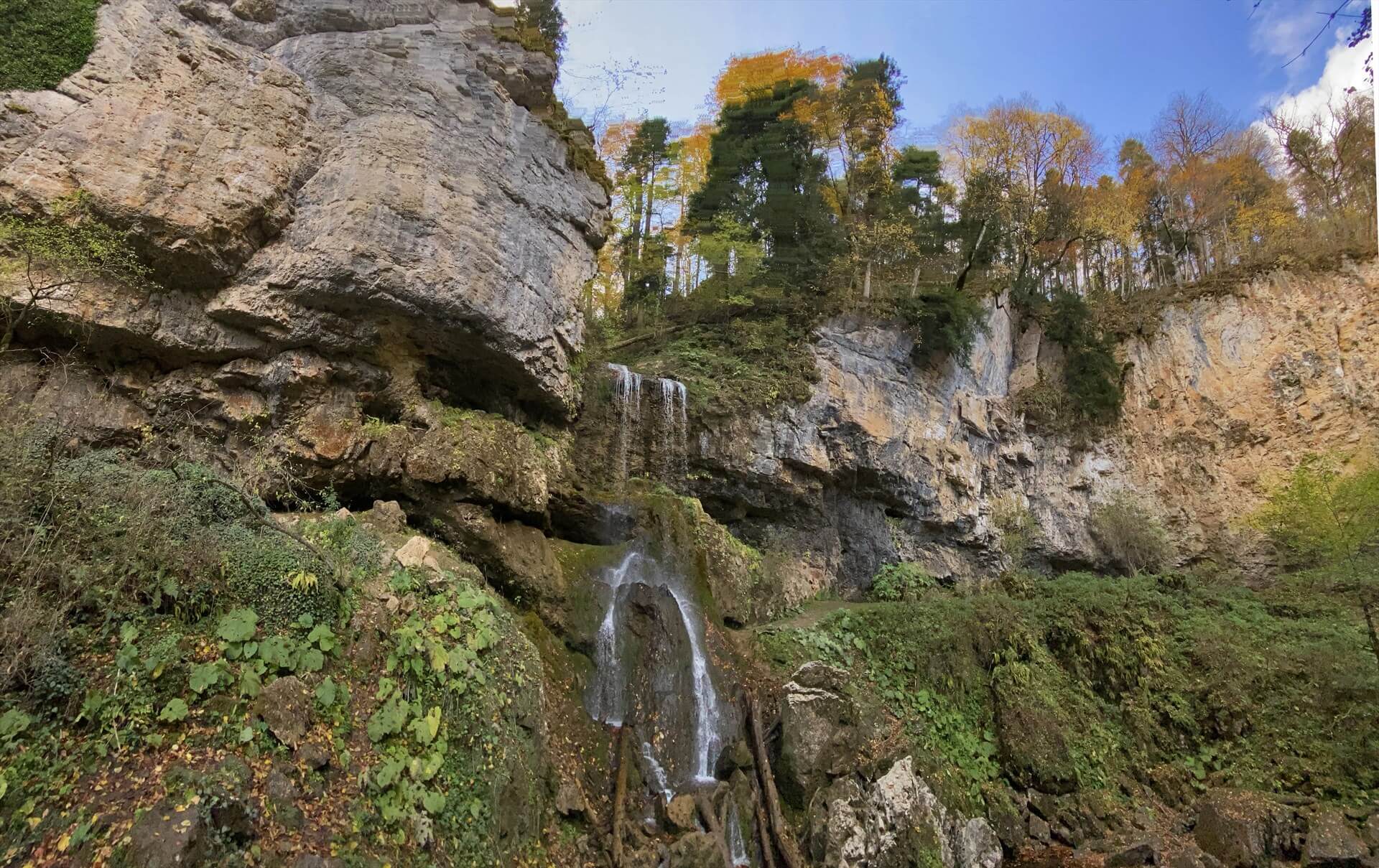 Вода срывается с высоких террас на обширные просторы ущелья. Колорит здешним местам придает растительность – буковые заросли деревьев, обвитые колхидским плющом.