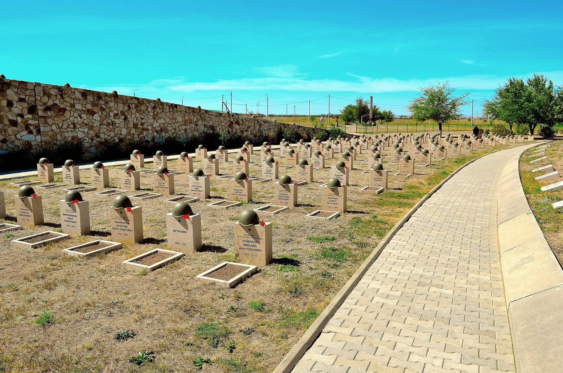 Экскурсовод расскажет, как в селе Большие Россошки в 1942-1943 годах происходили ожесточенные бои. Здесь погибли тысячи советских и немецких солдат. Солдатами и офицерами 87-й стрелковой и 35-й гвардейской дивизий в августе 1942 года остановлен прорыв вражеских войск к Сталинграду. В ходе этих тяжелых боев сёла Большая и Малая Россошка уничтожены, а темп наступления вражеских сил потерян. С этого момента Сталинградская битва перешла на стадию позиционных боев, в которых немцы потерпели сокрушительное поражение. Здесь же совершен прославленный подвиг Сталинградской битвы – подвиг 33 героев. 24 августа 1942 г. батальон немецких автоматчиков и танки прорвались к высоте, где держали оборону 33 воина 87-й стрелковой дивизии под командованием младшего лейтенанта Г.А. Стрелкова и младшего политрука Г.А. Евтифеева. Солдаты дивизии, вооруженные только одним противотанковым ружьем, гранатами и бутылками с зажигательной смесью, два дня вели неравный бой с врагом. Во время этого боя силой и храбростью воинов выведены из вражеского строя 27 танков и уничтожено больше 100 гитлеровцев. В 1998 году 23 августа было открыто советское военно-мемориальное кладбище, а 15 мая 1999 года открыто кладбище немецких солдат. Центральная фигура советского кладбища – шестиметровая бетонная скульптура «Скорбящая мать», выполненная скульптором Сергеем Щербаковым. Скульптура представляет собой стилизованную фигуру женщины, держащей над головой колокол с вырванным языком. В Лондоне 9 мая 1999 года установлена трехметровая бронзовая копия «Скорбящей матери» без говорящего колокола. А в 2001 году под Берлином в Германии на интернациональном кладбище установлена скульптура с «говорящим» колоколом «Скорбящая мать». Слева и справа от скульптуры 15 братских и 200 индивидуальных могил, в которых покоиться прах 19 тысяч советских воинов. Кладбище немецких солдат состоит из двух частей. Одна часть в виде прямоугольника, в которой покоятся останки 1639 солдат. Вторая часть в виде чаши диаметром 120 метров, в которой захоронено 60 тысяч немецких солдат и офицеров. Имена написаны на бетонном кольце, окружающем общую могилу. Рядом с этой братской могилой – гранитные кубы, на которых выбиты имена 120 тысяч солдат и офицеров, считающихся без вести пропавшими. Рядом с немецким мемориалом 25 октября 2015 года открыто первое в России захоронение румынских солдат, погибших в годы Великой Отечественной Войны. До этого останки румынских военнослужащих захоронялись в немецкой части Военно-мемориального комплекса. На стене-пропиле, которыми открывается мемориал, выбиты строки из песни Владимира Высоцкого: «Здесь раньше вставала земля на дыбы, А нынче гранитные плиты. Здесь нет ни одной персональной судьбы, Все судьбы в единую слиты.»