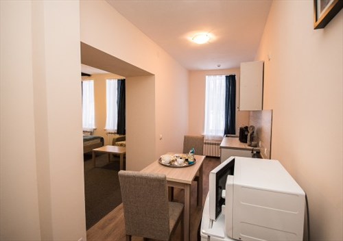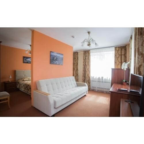 В номере: двуспальная кровать (160*220 см), дополнительное место - диван, холодильник, письменный стол, гардероб, телефон, набор столовой посуды, чайник, телевизор, кондиционер, фен, сейф.-