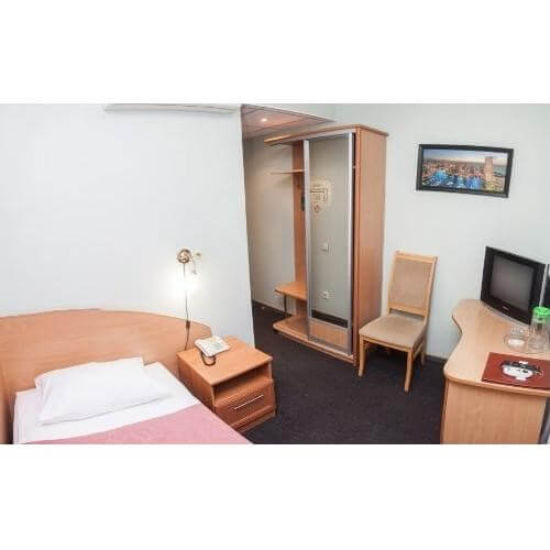В номере: стандартная односпальная кровать, письменный стол, гардероб, телевизор; мини-бар, кондиционер, фен, посуда - графин, стаканы.-