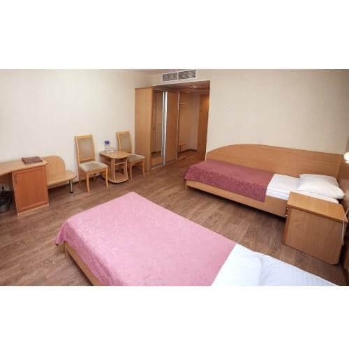 3-местный номер «семейный» (две кровати+раскладной диван)Свободные номера по запросуОднокомнатный номер, площадью 33 кв. м, включает в себя спальню с двумя кроватями 80*200 см, раскладной диван, комод, мини-кухню, дополнительный выход, ванную комнату с душевой кабиной, цифровое TV.