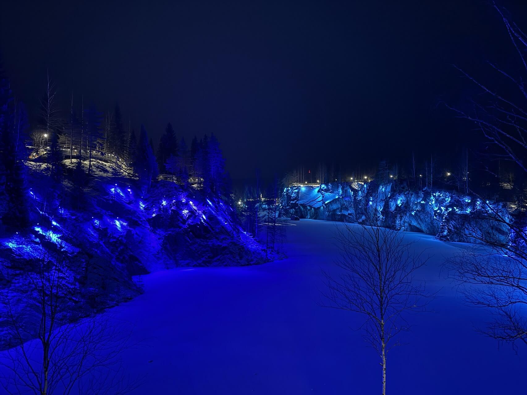 Горный парк «Рускеала» – главная круглогодичная достопримечательность Карелии. Территория горного парка огромна. Центром интереса является Мраморный каньон – большое, вытянутое с юга на север озеро с кристально чистой водой и отвесными берегами, состоящими из настоящего мрамора. Именно здесь когда-то добывали этот декоративный камень для отделки архитектурных шедевров Санкт-Петербурга. А благодаря темнеющим хвойным деревьям, снежному убранству и цветной подсветке на скалах пейзаж получается действительно сказочным! Художественная подсветка в Мраморном каньоне включается в период холодного времени года, ориентировочно с ноября по март. Время включения подсветки зависит от времени наступления темноты.