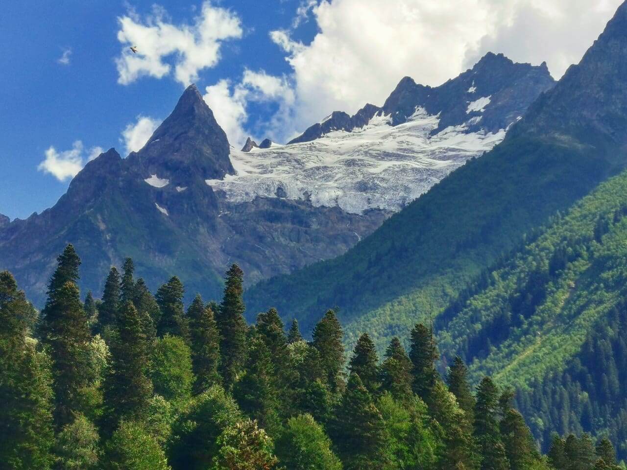 Домбай – это долина, по кругу ограниченная горами – типичный горный цирк. Среди них и высочайшая точка Западного Кавказа – гора Домбай-Ульген («убитый зубр»), высота 4047 м над уровнем моря. Подъем на канатных дорогах на высоту 3000 м.